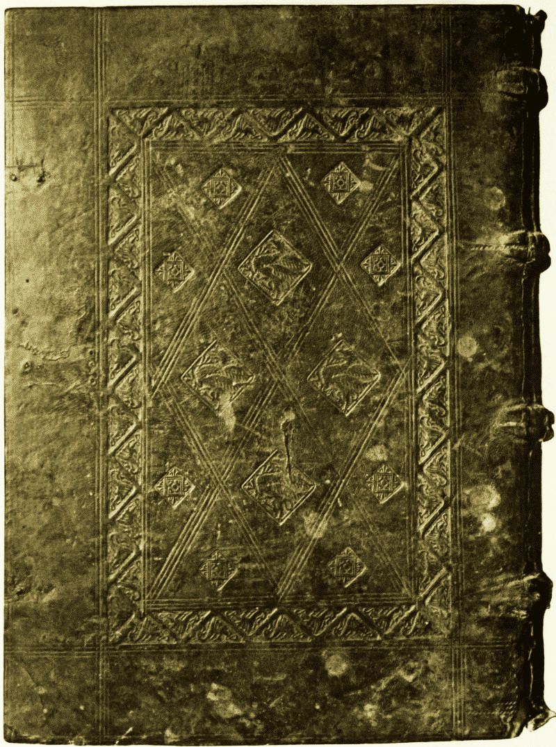 Caxton, like all other printers at that time, numbered bookbinders amongst his workmen and issued his books ready bound. Every genuine binding from his workshop is of brown calf, ornamented with dies. His general method of covering the sides of his bindings was to make a large centre panel contained by a framework of dies. This panel was divided into lozenge-shaped compartments [pg 85] by diagonal lines running both ways from the frame, and in each of these compartments a die was stamped. The die most commonly found has a winged dragon or monster engraved upon it. The framework was often composed of repetitions of a triangular die pointing alternately right and left, also containing a dragon. This die is interesting, not only because the use of a triangular die was uncommon, but because it was an exact copy of one used by a London binder of the twelfth century.