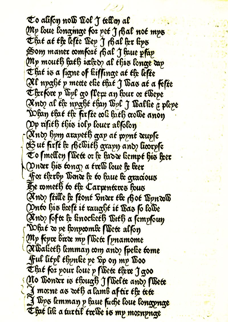 The History of Blanchardine and Eglantine is also known only from an imperfect copy which was in the Spencer Library. It is impossible to settle what the correct collation may have been, as the book breaks off abruptly at leaf 102 and all the remainder is wanting. As, however, the last chapter of the work is just beginning on the last remaining page, it seems probable that only the last quire is missing. On the fly-leaf is a curious note in Lord Spencer's handwriting relating to its purchase. "This book belonged to Mr. G. Mason; at whose sale it was bought by John, Duke of Roxburghe. The Duke and I had agreed not to oppose one another at the sale, but, after the book was bought, to toss up who should win it; when I lost it. I bought it at the Roxburghe sale, on the 17th of June, 1812 for £215 5s." At the earlier sale the Duke had paid £21 for it. This book was undertaken at the request of Margaret, Duchess of Somerset, who brought to Caxton a copy of the French version, which she had long before purchased from him, commanding him to translate it into English.
