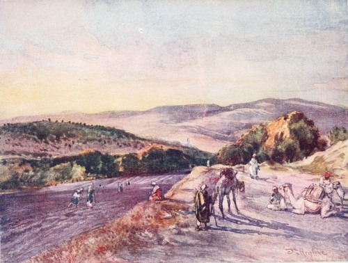 The Jordan valley is the greatest example, running south along its whole length, “a green serpent” between the pale mountains of the east and the faint mosaic of the western land. Its jungle is uncompromisingly distinct throughout the entire course, and its colour is living green, with a white flash of broken water or a quiet flow of brown bursting here and there through the verdure. Other streams are similarly marked, with luxurious undergrowth of reeds, varied by clumps of hollyhock or edged with winding ribbons of magenta oleander. But the most striking oases of this kind are the valley of Shechem and the city of Damascus. There is a hill seldom visited by tourists, but well worth climbing, set in the broad vale of Makhna, right opposite Jacob’s Well. North and south past the foot of this hill runs the broad valley. It is edged on the western side by the continuous line of the central mountain range of Samaria—continuous except for one great gash, where, as if a giant’s sword had cleft the range, the valley of Shechem enters that of Makhna at right angles. The whole landscape is in dim colour except for that valley of Shechem. Ebal and Gerizim guard its eastern end, dull and rocky both. But the valley which they guard is fed by countless springs and intersected by rivulets, so that below the shingle of their slopes there spreads a fan-shaped expanse of intensely vivid green, like a carpet flung out from Nablus between the mountains. The lower edge of the green is broken by the white wall of the enclosure of Jacob’s Well, and the cupola of{14} Joseph’s tomb. Damascus—surely the most bewitching of cities—owes its witchery to the same cause. The river Abana spends itself upon the city. As you approach it from the south it discloses itself as a mass of bold outline and high colour in the midst of a great field of verdure, flanked on the west by precipitous hills of sand and rock—sheer tilted desert. When you climb those hills you see the white city, jewelled with her minarets of many hues, resting on a cloth of dark green velvet whose edge is sharply defined. Immediately beyond that edge the sand begins, stretching into the farther desert through paler and paler shades of rose and yellow to the lilac hills in the eastern distance.