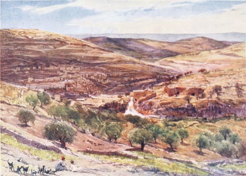 The whole land is stony, but Judea shews this at its worst. It is an immense stone wedge thrust into Palestine from east to west. South of it lie the fertile valleys of Hebron, with their wealth of orchard and plantation. North of it open the “fat valleys” of Samaria, winding among rounded hills planted to the top with olives, or terraced for vines. Over these, here and there, a red cliff may hang, or the irrigation ditches may furrow and interline a vale of dove-coloured clay. But while the green of Judea is for the most part but the thinnest veil of sombre olive-green, a mere setting for the rocks, Samaria is a really green land, variegated by stone.