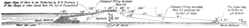 At the close of the fiscal year 1908–’09 three 20-inch suction dredges were depositing material over the area between the rock piles, and the fill had reached an average elevation of 16 feet above sea-level. A total of 2,501,372 cubic yards was placed in the dam during the year.