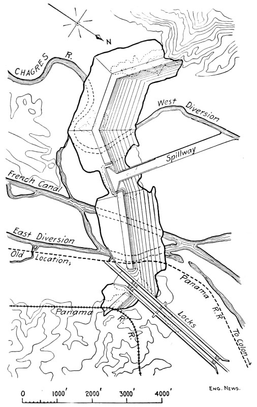 The New Panama Canal Company was organized in October, 1894. It proposed to construct a sea-level canal from the Atlantic as far as Bohio (See Map, pp 45), where a dam was to form a lake as far as Bas Obispo, the difference in elevation being overcome by two locks. The summit level extended from Bas Obispo to Paraiso, and was reached by two more locks and received water from an artificial reservoir formed by a dam at Alhajuela in the upper Chagres valley. Four dams were located on the Pacific side, the two middle ones at Pedro Miguel combined in a flight.