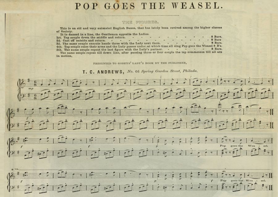 1st. Top couple down the middle and return. 8 Bars. 2d. Cast off outside and return. 8 Bars. 3d. The same couple execute hands three with the Lady next them. 8 Bars. 4th. Top couple raise their arms and the Lady passes under, at which time all sing Pop goes the Weasel 8 B's. 5th. The same couple repeat the last figure with the Lady's partner. 8 Bars. The same couple repeat till down line, after passing three or four couple the top commences till all are in motion.