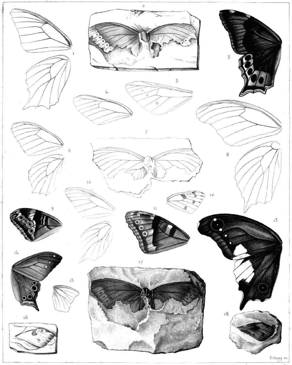The happy discovery in the Museum of Marseilles of a new fossil butterfly first drew my special attention to this group of extinct insects, and determined me to make, during my residence in Europe, a careful study of the original types of all that had been previously described. By the great courtesy of Count Saporta, Professor Heer, Dr. Reynès, Mr. Oustalet, Mr. Woodward, the Rev. Mr. Brodie, Mr. Charlesworth, and the authorities of the Jermyn street Museum, I was able to study not only all the originals of the Museums of Aix, Marseilles, Zurich, Paris, London, Cambridge and Warwick, but several new types, described here for the first time. As I was unable to visit Vienna, Mr. Brunner de Wattenwyl was good enough to procure for me new drawings, made under his immediate supervision, of the species from Radoboj, described by Heer and preserved in the museums of that city. So that I have either personally inspected all the fossils described within recent times as butterflies, or have procured new and excellent original drawings of them, with the exception of Heer’s Vanessa attavina (Sphinx atava Charp.), which I was unable to find, and two fragments of slight value, viz.: the hind wing referred by Heer to his Vanessa Pluto, and the portion of a hind wing, called Cyllonium Hewitsonianum by Westwood. In the hope of drawing attention to fossil butterflies, which have been hitherto so little studied, I have brought together in this connection all that has been published of this group of fossils, whether of text or illustration; presenting thus, within a small compass, a complete account of our knowledge of these insects, as a basis for future investigations.