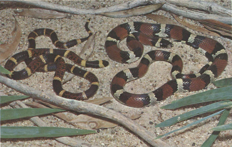 Description—Generally less than two and a half feet long, this is our most colorful venomous snake and, at the same time, the least dangerous in appearance. Its small, narrow head, slender body and brightly colored pattern can be dangerously misleading. Children, especially, are inclined to pick it up because they are attracted by its colors and convinced that such beauty must be harmless. The pattern consists of red, yellow and black rings which encircle the body in the following order: a broad black ring, a much narrower yellow ring, a broad red ring, a narrow yellow ring, a broad black ring, and so on. Note that the red and yellow rings on the body touch one another. The snout is black and a broad yellow ring crosses the back of the head.