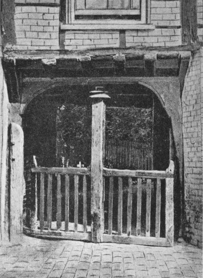 The lychgate which forms the western entrance to the churchyard at Lenham, Kent, comprises two passage ways, each having a four-centred arch of timber overhead. The narrower gate, that on the south, has the head cambered out of a single piece of oak to the four-centred outline. The northern, the wider gate, has the head built together of two pieces, shaped to the requisite form. The supporting struts and braces are much worn with age and weather, but happily unrestored. The roof is tiled. The main part of the timberwork is of the fifteenth century, says Mr E. C. Lee, except the roof, the rafters of which, built into the adjoining house, are "very poor and rough.... The strutting at A is bad in construction, all the strain being thrown on the pins." There is a tradition that this gate was brought hither from Canterbury some time about 1770; but it is, in all probability, without historical basis, as also are many other traditions of a similar kind.