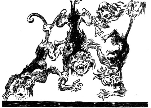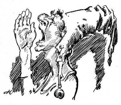 "An elephant, a flying elephant!" panted Chunum, dragging Samuel from under the immense shadow. "Flatten yourself in the sand, seaman, and we may yet be spared." As Samuel, more amazed than scared at so strange and curious a specimen, and even vaguely hopeful of capturing the unwieldy creature, made no move, Chunum dragged him down by main force. The elephant meanwhile lighted like some gigantic butterfly on the edge of the cliff. Fairly bleating with fright and terror, the nine Ozamandarins watched him swooping toward them with a sinister and soundless speed. Just behind his ear perched Boglodore, the Old Man of the Jungle, looking cruel and ugly as the genie of all evil.