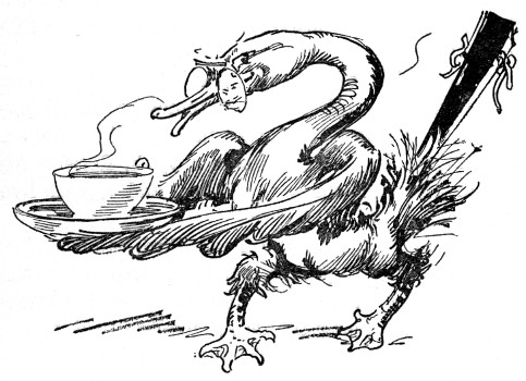 In his eight-sided castle, he has every modern convenience and comfort and some of which even an up-to-date country like our own cannot boast. For instance, take Roger, his Royal Read Bird. Roger, besides knowing eight languages, can read aloud for hours at a time without growing hoarse or weary. So Ato never has to strain his eyes poring over his eight hundred huge volumes of adventure and history, nor his arms holding a newspaper or court document, nor his jaw pronouncing the names of kings and countries in Ev and Oz and other curious places on the mainland west of his own island. And Roger is as handsome as he is handy, his head and bill rather like a duck's, his body shaped and colored like a parrot, but much larger, while his tail opens out into an enormous fan. This is extremely fortunate, for the Octagon Isle is semi-tropical in climate, and on warm sultry days, Roger not only reads to his Majesty, but fans him as well. All in all, Ato's life is decidedly luxurious and lazy.