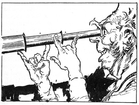"Revenge! Revenge!" shrilled the turbaned native, clenching his fists. "Now shall Boglodore have his reward!" Addressing himself to Chunum and Samuel Salt, the Old Man of the Jungle began screaming out the story of his wrongs. "For these scheming rascals I carried away on Umbo, my great and useful umbrellaphant, the young King of this country. For this I was to receive one-tenth of the Kingdom, the Ozamandarins themselves to divide the rest of the country among them. But Hah! What happened?" Dancing up and down on the elephant's head, Boglodore again clenched his fists, his face distorted with rage and fury. "What happened? Why, these miserable cheats refused to pay me, intending to keep the whole country for themselves. But hearken well, you and YOU!" Jerking his thumb contemptuously toward his rigid and helpless enemies, the Old Man continued his story.