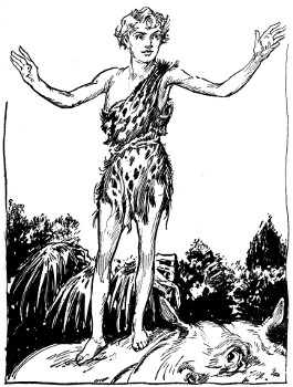 Shuddering and in a tense silence, Samuel and the Sheik watched the umbrellaphant toss the wretched Ozamandarins one after the other into the sea. The immense zooming monster fascinated the Captain of the Crescent Moon. Not wings, but a balloon-like structure of its own tough skin billowing over its back like a howdah, enabled Umbo to navigate in the air. Samuel was anxious for further talk with the Old Man of the Jungle, but as the last Ozamandarin fell over the cliff the umbrellaphant, with a trumpet of defiance, headed rapidly for the open sea.
