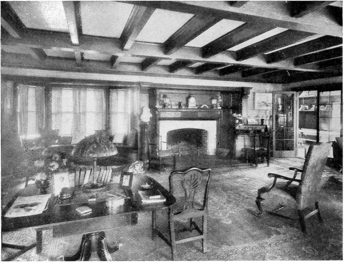 The treatment of the room is Colonial. A low wainscot, 2 ft. 6 in. high, comprising a base, panel, and cap, is carried around the room. The ceiling is beamed with four substantial beams and a half beam to form a cornice around the room at the junction of the wall and ceiling. Over the heads of the doors and windows there is a wide wooden frieze with a cap which ties them, one might say, to the bottom of the cornice, and makes them more completely an integral part of the woodwork. The window stools form a part of the wainscot cap.