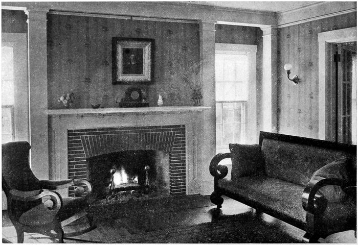 Much of the Colonial carving was extremely simple. Here added decorative detail appears in the old-fashioned fireback of modeled iron. The covering of the old rosewood furniture is quite in harmony with the wallpaper