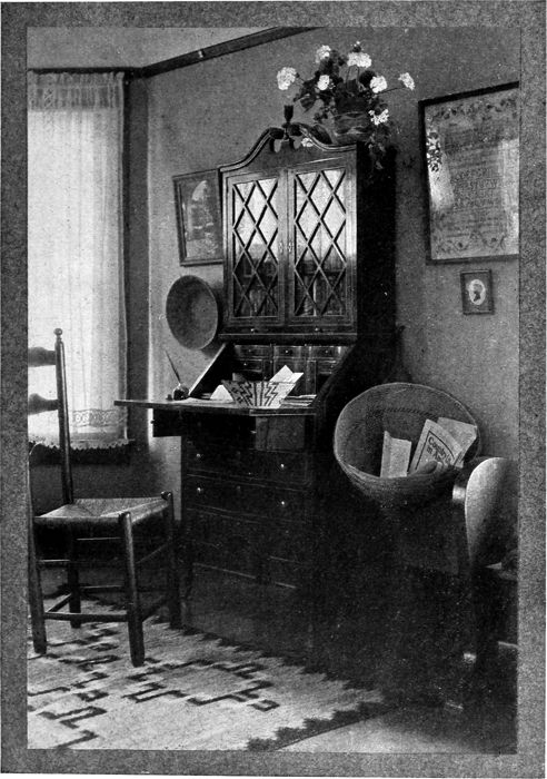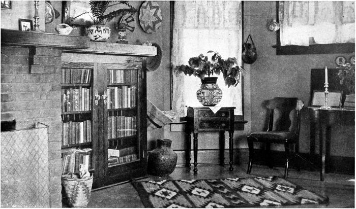 Another corner of the bungalow living-room on page 18 shows a good type of secretary. The Navajo rugs seem to add a tone of vigor that is not found in the rag rugs generally used in this connection