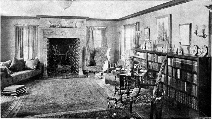 There is surely a decorative quality in bookcases that is heightened by the color of books when arranged properly. Perhaps the results might have been better had all the bookcases been built the same height entirely around the room. The furniture here is of a type that is particularly comfortable and wears well