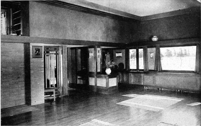 The architects of the West are achieving distinction in the creation of a particular style. This interior is characteristic of their work. Horizontal lines are emphasized and colored brickwork enters as a part of the decoration
