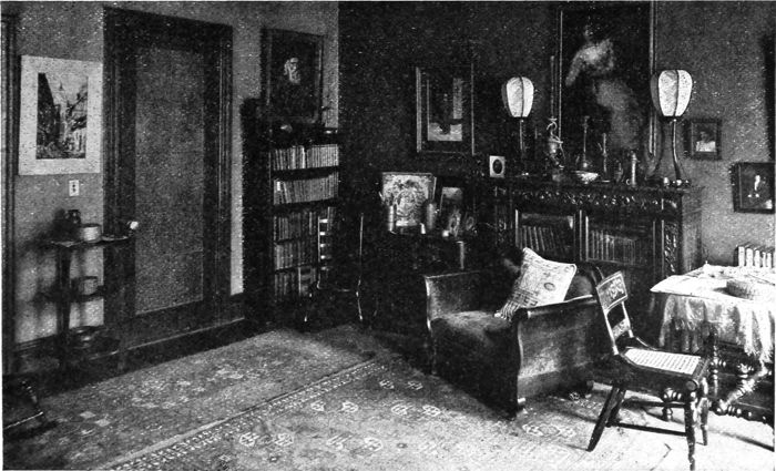This studio living-room is a successful exponent of the same principle of color harmony shown in the previous illustration. A heterogeneous collection of various styles of furniture is rendered harmonious by the use of kindred tones of browns, tans and dull reds