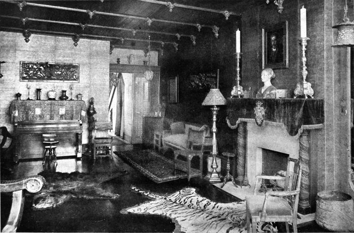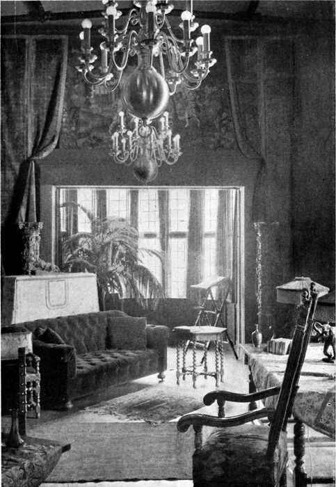 Another example of the two-story living-room is here shown in more elaborate style where the precedent was the Manorial hall of England. Tapestries and heavy wall papers are used and the chandeliers are large and elaborate