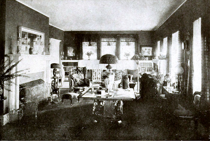 In order to obtain the real benefit of the fireplace, it is necessary to have a broad comfortable sofa or an upholstered mahogany seat in front of it. In back of this should be a small mahogany table on which an ornamental lamp may stand. On each side of the table can be drawn up large comfortable chairs. This arrangement permits the light of the lamp to fall in the correct position for anyone wishing to read in the chairs or on the seat in front of the fireplace. At one side of the fireplace a large wing-chair would be well placed. The bookcases would, of course, be unnecessary if there were a library in the house, but where the living-room is to answer the general purposes of the family, the book-shelves would be found very useful, and could be movable or built in as part of the finish. Between the northern windows a fine position is obtained for the piano, on the right of which is a good place for a davenport.