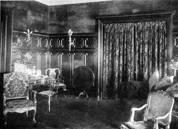 The finish of the room is white wood, given four coats of lead and oil paint, with a fifth coat of white enamel, rubbed down, and a sixth and final finishing coat of enamel of an ivory shade that dries out with a very dull satin-like luster that is very durable and not easily marred. Above the wainscot the walls are covered with a heavy background paper having a body color almost of a putty shade, enlivened in certain lights with a pinkish caste. This is accented by the panels, between the windows and doors, of a delicately hued fabric with a foliated striped design. A flat molding covers the edge of the fabric and forms the panel. In order to balance these and add character to the room, the draperies at the windows and doors are of soft blue velour, without which the scheme would be lifeless and flat. The facing of the fireplace is of Sienna marble surmounted with a simple mantel, consisting merely of a heavy classical architrave, with a shelf above and a large plate glass mirror over it. One must not lose sight of the fact that the colors of this room, while light and delicate, are[10] all very rich and warm, due to the predominating ivory color of the woodwork, enlivened and strengthened by the richer and heavier color used in the panels and curtains.