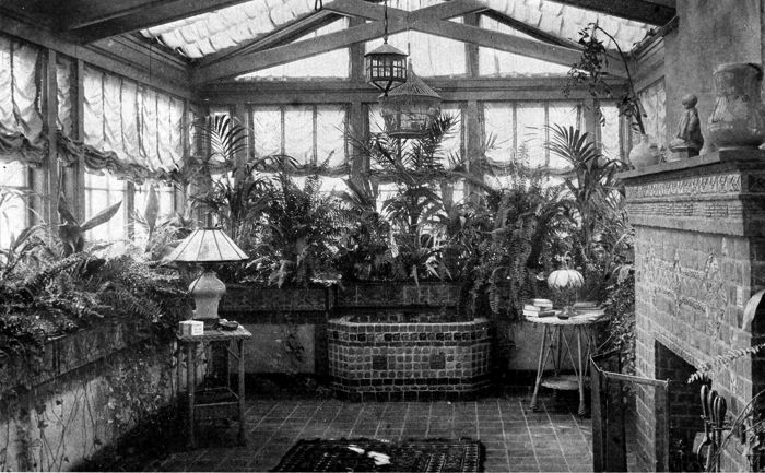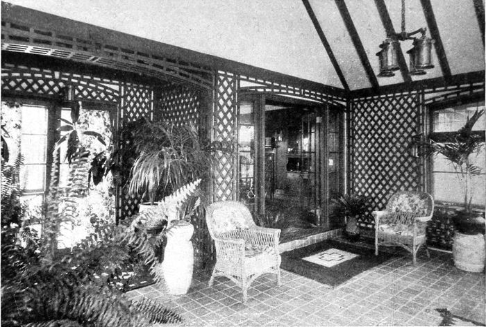 There is a growing desire to build living-rooms that open into the light and air. This is as completely furnished as any other room in the house, but is given a dark stained lattice background as suitable for plants
