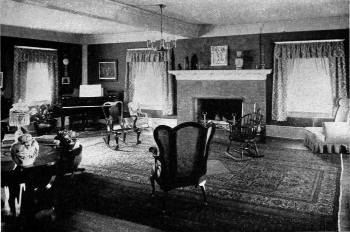 The ceiling is sand-finished and tinted to match the walls. The floor is of quartered oak, filled and given two coats of a finish which produces a durable even surface with a dull luster that is not so slippery as a waxed floor. The disposition of the rugs over this floor is a matter of personal taste and the amount one can afford for rugs. The rugs should be Oriental and of light uniform coloring. The plans show probably the most economical way of covering the floor—using one large rug as a center and filling with smaller rugs. One large rug might be obtained that would extend from the piano to the pier glass, but it would have to be an odd shape or specially made. Two large rugs might be used, one in each end of the room, with a small rug to fill in before the fireplace. The approximate positions and proper design for the various pieces of furniture used in the room are indicated.