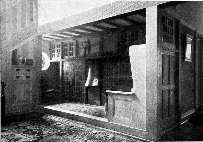 The living-room in the same house is rendered distinctive by a large inglenook. It is finished in rough plaster and colored in a light tan