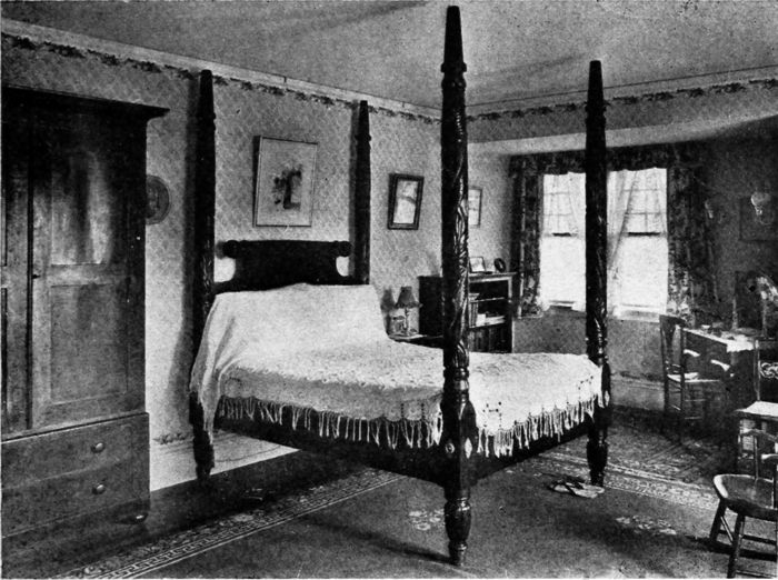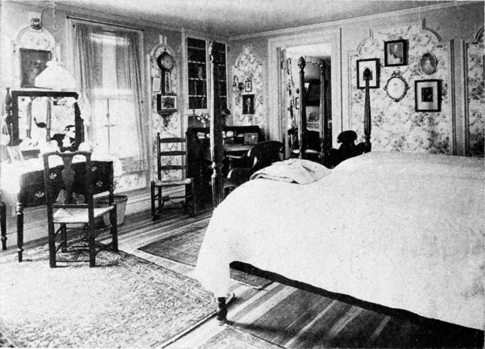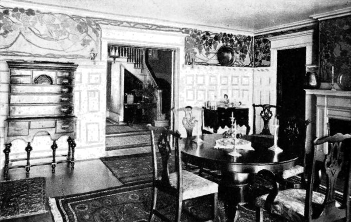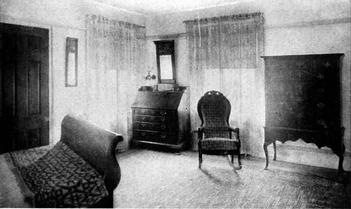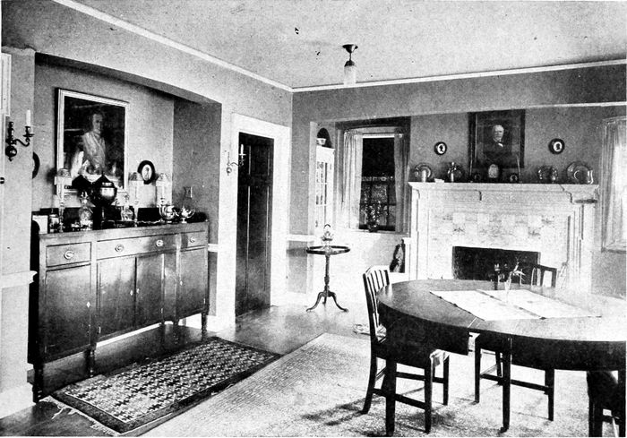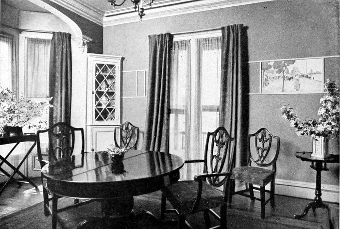 The cost of the furniture used in this room, covered in cotton, made from the architect's drawings, would be as follows: 18th century sofa, rolled ends, $90; and it requires 3-1/6 yards of 50-inch goods to cover it. Low-boy with drawers, $90—size 2 ft. 6 in. × 4[13] ft. 6 in. Tip-top tea table, 38 in. in diameter, $60. Martha Washington wing-chair, $54, in cotton; requires 5 yards of 50-inch goods to cover. Martha Washington armchair, $40, in cotton; requires 2 yards of 50-inch goods to cover. The crown ladder-back side chairs would cost about $35 each in cotton, and the armchair to match, $40.