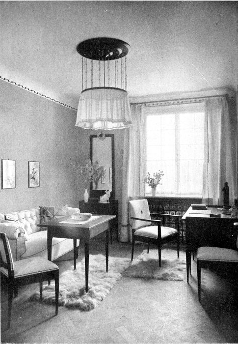 The living-room of two stories and with mezzanine floor is receiving more and more favor for its spacious effect. The simple woodwork in this room is well chosen and there is a good suggestion in the lighting fixtures