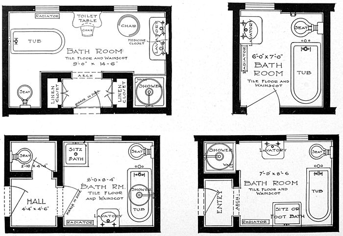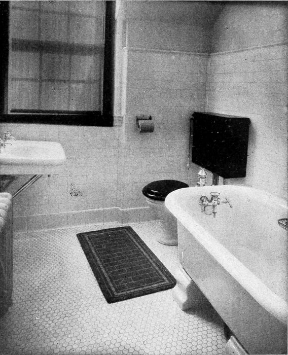 2nd. The general construction of the interior is of the utmost importance. The floor may be of hard Georgia pine, oiled, or covered with linoleum or oilcloth. As a covering, linoleum of a good inlaid pattern, while more expensive than oilcloth, proves the best and most economical in length of service. In a house where comfort is demanded regardless of cost, an interlocking rubber tiling[119] is suggested. This flooring absolutely avoids noises and slipping and is comfortable to the feet, as well as being of an exceptional durability. Other floors of a well-merited character are unglazed tile, brick, or one of the many patented compositions consisting chiefly of cement, which is also fireproof.