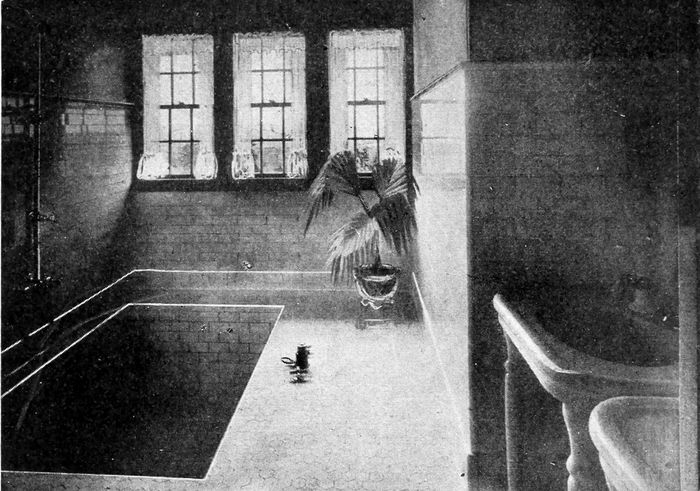 The walls and ceiling, if not tiled or bricked, should be finished with a hard smooth plaster and painted three or four coats of some light color—light yellow, green, or blue making a very agreeable color to the eye. This manner of treatment permits the walls to be washed and kept free from dust and dirt, which latter is a disagreeable feature in the use of wall papers.