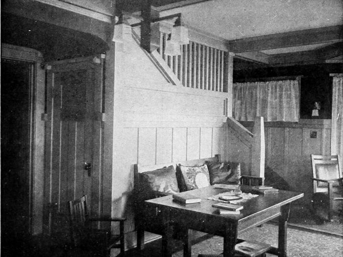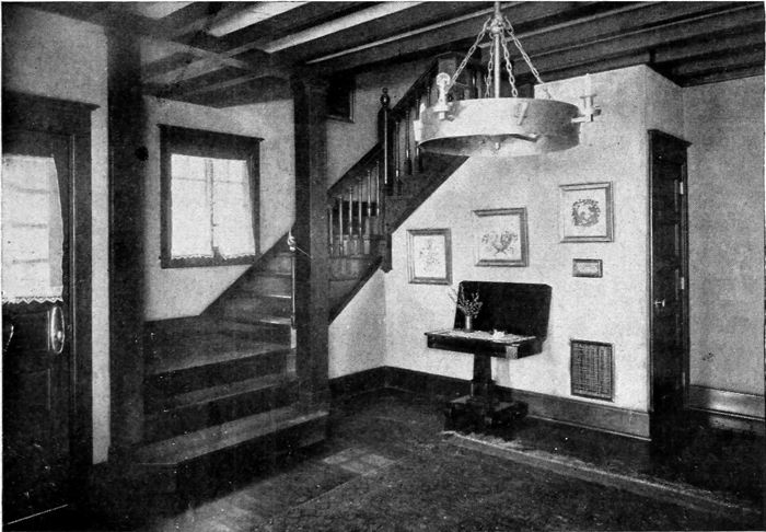 This view shows to good advantage the value of an archway between living-room and hall. Woodwork, simply carved, frames in delightfully the stairway which is so appropriately treated with a forest frieze. Curtains would be objectionable here