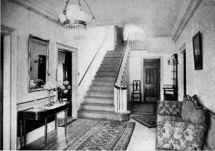 This hall is of generous width, and the stairs rise straight with but one landing lighted by a large window. A window is almost a necessity in the hall as it permits a free circulation of air throughout the house
