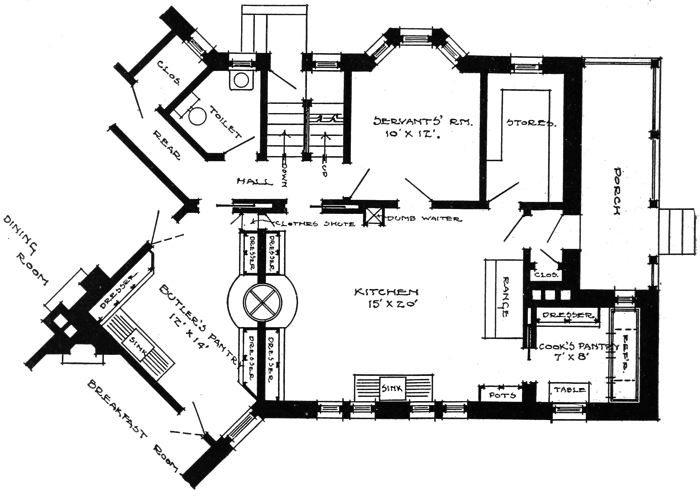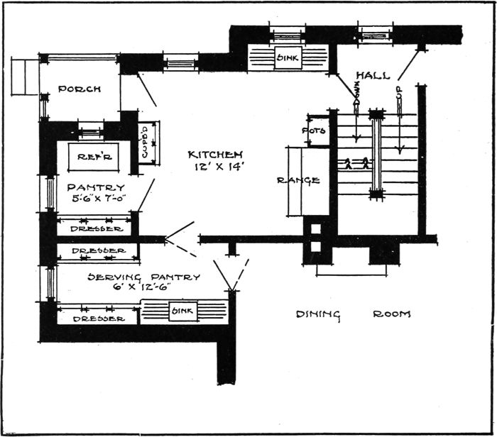 The service part of the house, of which the kitchen is the central room, should fit together just as parts of a machine and form a[124] unit in themselves. The pantries, store rooms, etc., should be placed so as to afford easy access one to the other.