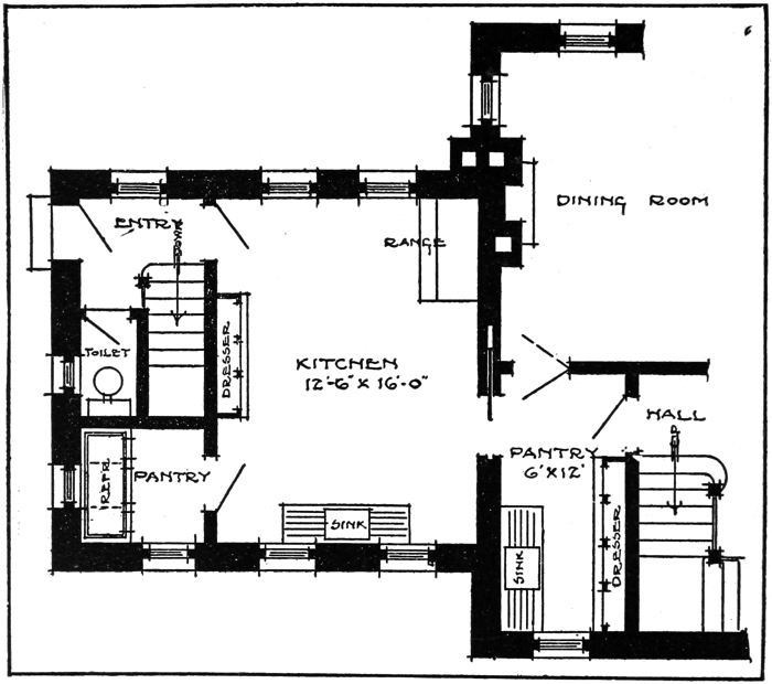 A feature of this plan is the sliding door connecting the kitchen and pantry. This may be closed when cooking is in progress and successfully keeps all odors from finding their way into the dining-room. Opposite windows provide a cross draft and excellent ventilation