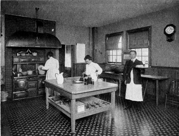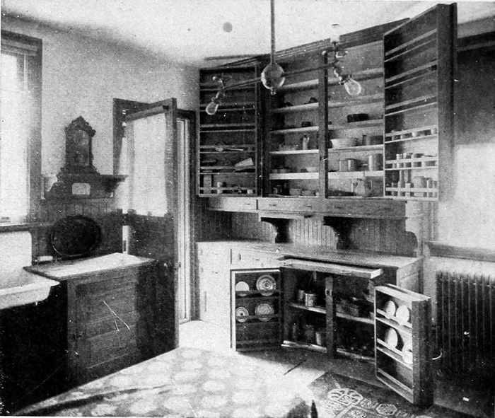 There is a growing and altogether proper tendency to treat the kitchen as an integral part of the house, which was almost entirely absent in English and American houses of early times; in fact, until within the last twenty-five years very little thought was attached to it. A century ago it was regarded advisable to have the kitchen occupy a separate building somewhat removed from the main building or located at a great distance from the dining or living rooms, ofttimes the whole length of the house. The principal reason for this was the primitive methods used in cooking and preparing foods which were very objectionable at close range. Odors, noises and unsanitary appliances made the kitchen a place to be abhorred and to be kept as far away as possible. The present-day intelligent methods of dealing with the kitchen, particularly in America, have effected a complete transformation in this old idea. Our modern successful architect of the home attaches great importance to the planning of the kitchen, with its adjoining pantries, closets, storage rooms, etc.; and rightfully he should, as it goes more towards making for the convenience, help and comfort of the up-to-date household than possibly any other feature of the home.