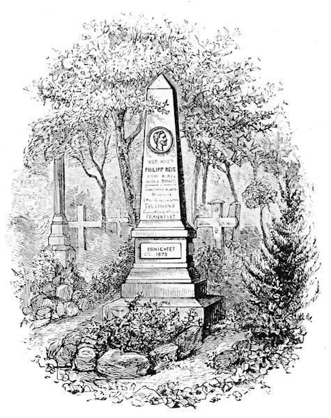 “The Society has erected to the memory of its former member, the inventor of the Telephone, Philipp Reis (deceased in 1874), teacher, of Friedrichsdorf (see ‘Jahresbericht,’ 1860-61, pp. 57-64; and 1861-62, p. 13), in the cemetery of that place, a monument which was inaugurated on the 8th of December, 1878. This monument, an obelisk of red sandstone, bears in addition to the dedication, a well-executed medallion portrait of Philipp Reis, modelled by the sculptor, A. C. Rumpf, and executed galvanoplastically by G. v. Kress.”