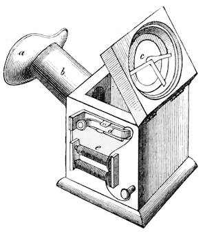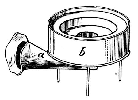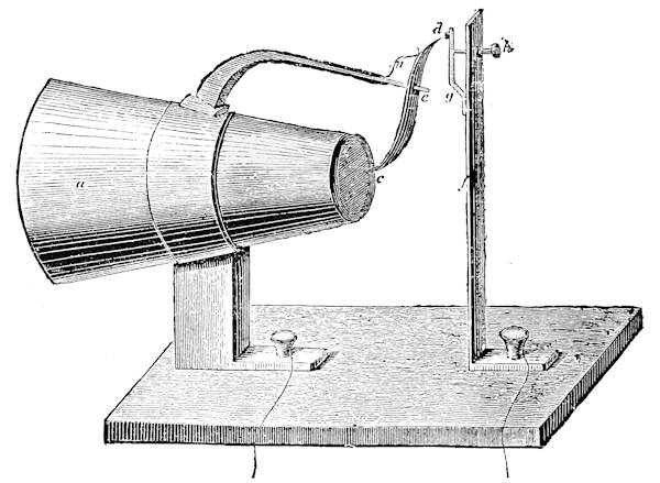 The second form, a tube constructed by Reis himself, of tin, is still to be seen in the Physical cabinet of Garnier’s Institute, at Friedrichsdorf, and is shown in Fig. 7. It consists of an auditory tube a, with an embouchure representing the pinna or flap of the ear. This second apparatus shows also a great similarity with the arrangement of the ear, having the pinna or ear-flap, the auditory passage, and the drum-skin (a, b, c). Upon the bladder c there still remains some sealing-wax, by means of which a little strip[19] of platinum, for the all-essential loose-contact that controlled the current, had formerly been cemented to the apparatus.