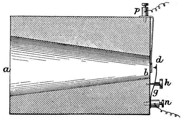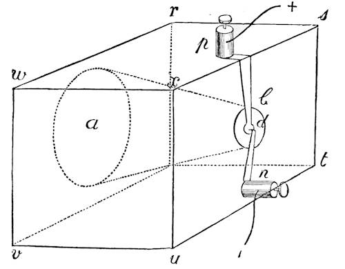 “In a cube of wood, r s t u v w x, there is a conical hole a, closed at one side by the membrane b (made of the lesser intestine of the pig), upon the middle of which a little strip of platinum is cemented as a conductor [or electrode]. This is united with the binding screw p. From the binding screw n there passes likewise a thin strip of metal over the middle of the membrane, and terminates here in a little platinum wire, which stands at right-angles to the length and breadth of the strip. From the binding-screw p a conducting wire leads through the battery to a distant station.” The identical apparatus used by Reis was afterwards given by him to Professor Böttger, who later gave it to Hofrath Dr. Th. Stein, of Frankfort, from whose hands it has recently passed into the possession of the author of this work. It possesses one feature not shown in the original cut, viz. an adjusting screw, h, which, so far as the writer can learn, was put there by Reis himself. There appears no reason to doubt this, since there was an adjusting screw in Reis’s very earliest form of transmitter, the wooden ear. A section of the actual instrument is given in Fig. 10.