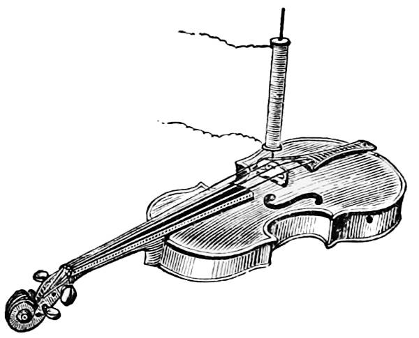The first form of apparatus used by Reis for receiving the currents from the transmitter, and for reproducing audibly that which had been spoken or sung, consisted of a steel knitting-needle, round which was wound a spiral coil of silk-covered copper-wire. This wire, as Reis explains in his lecture “On Telephony,” was magnetised in varying degrees by the successive currents, and when thus rapidly magnetised and demagnetised, emitted tones depending upon the frequency, strength, etc., of the currents which flowed round it. It was soon found that the sounds it emitted required to be strengthened by the addition of a sounding-box, or resonant-case. This was in the first instance attained by placing the needle upon the sounding-board of a violin. At the first trial it was stuck loosely into one of the f-shaped holes of the violin (see Fig. 19): subsequently the needle was fixed by its lower end to the bridge of the violin. These details were furnished by Herr Peter, of Friedrichsdorf, music-teacher in[30] Garnier’s Institute, to whom the violin belonged, and who gave Reis, expressly for this purpose, a violin of less value than that used by himself in his profession. Reis, who was not himself a musician, and indeed had so little of a musical ear as hardly to know one piece of music from another, kept this violin for the purpose of a sounding-box. It has now passed into the possession of Garnier’s Institute. It was in this form that the instrument was shown by Reis in October 1861 to the Physical Society of Frankfort.