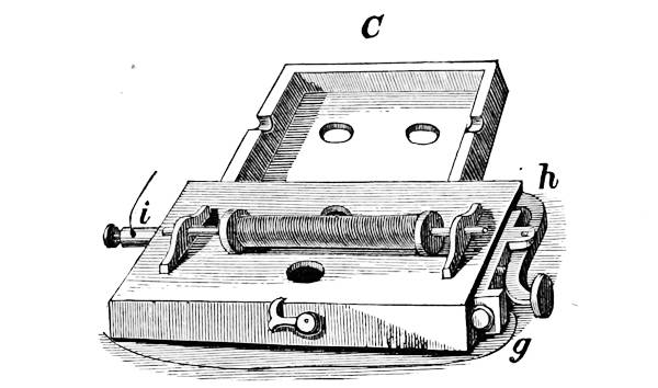 Our knowledge of this form is derived solely from information and sketches supplied by Mr. E. Horkheimer, who assisted Reis in its construction. Figs. 15 and 16 are engraved after Mr. Horkheimer’s sketches. The conical mouthpiece was of wood: the contact pieces of platinum. The point c was attached to a springy slip of brass, g, fixed across the wooden box; and the adjusting-screw, h, served to regulate the degree of initial pressure at the point of contact which controlled the current.