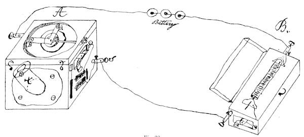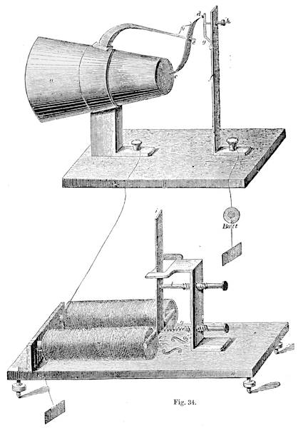 [32] [This rather obscure passage refers to the call-key or communicator fixed to the side of the instruments, and which as the inventor explains in his Prospectus (see p. 87), to be intended, like the call-bell or communicator of modern telephones, as a means of sending signals to the speaker, and which, as the Prospectus says, can also be used—as any call-bell can—for telegraphing words by a pre-arranged code of signals.]—S. P. T.