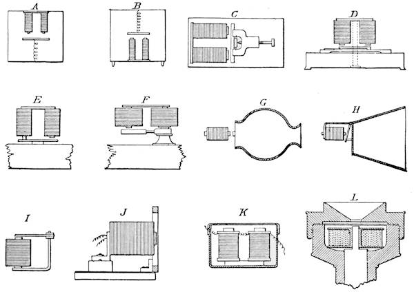 [54] Reis’s failures were chiefly with the vowels, Bell’s more particularly with the consonants. Reis’s contacts were liable to break, and the following-springs of his contact-regulators too little pliable. Bell’s transmitter could not open and close the circuit proportionally with the motions of the tympanum, and owing to the sluggishness due to self-induction in the coils of his telephone, the induced undulations of the current failed to come up in suddenness to those of the tympanum. In consequence whip sounded like whim, and kiss like kith, even in the perfected Bell Telephones made two years after Bell’s first “improvements” in telephony were patented.