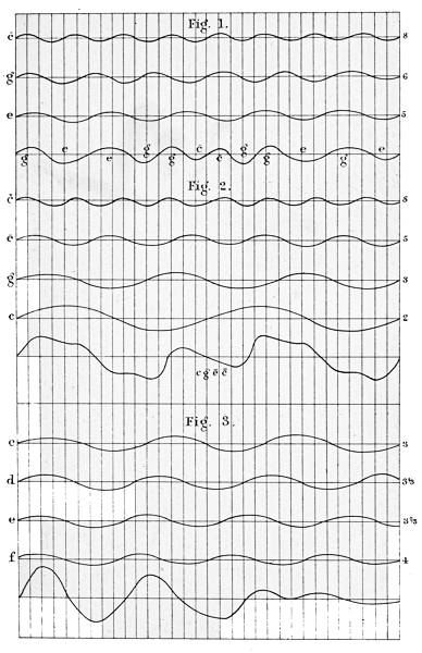 [16] [The three plates or tables with which Reis accompanied his Memoir, containing a variety of undulatory curves corresponding to various combinations of tones, both of musical concords and of dissonant sounds, are not reprinted in this book in their entirety. Table I. contained three sets, the first of which is reproduced by photo-lithography in reduced facsimile in Fig. 47, p. 173. It was also reproduced by W. von Legat in his Report from which Plate I. at end of this book is copied, Fig. 1 of that plate being the same as Fig. 1 of Reis’s Table I. Fig. 2 of Plate 1, was in like manner copied by Legat from the first figure of Reis’s Table II., and Fig. 3 of Plate I., which represents the curves of a non-harmonious combination is the same as Reis’s Table III., the only difference being that in Reis’s Table III. the irregular undulations of the resultant curve were emphasised by being labelled ‘Dissonanz.’]—S. P. T.
