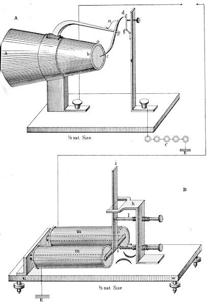 This form of instrument, which has been so frequently described in the Text-books of Physics, was constructed for sale first by Albert of Frankfort, later by Ladd of London, König of Paris, and Hauck of Vienna. Further details concerning it will be found in this book, in Reis’s “Prospectus,” and in other contemporary documents.
