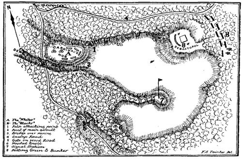 It is supposed that Colonel Howard with a force of two hundred and fifty men, together with an auxiliary bicycle corps of mounted riflemen, including two machine-guns, are intrenched upon the wooded ridge at the left and locally known as the "Cardinal's Nob." This ridge is the key to the country lying behind it, and must consequently be defended at all hazards. The position is naturally strong, as its steep sides are inaccessible except at the three points marked by the numerals 1, 2, and 3. The open space in front is part of the Quantico golf course, and a putting-green occupies the little knoll at 8. The green is defended by an earth bunker, and from its military appearance it is known to the golfers as "Sebastopol." In the woods immediately behind "Sebastopol" the forces of the enemy, under command of Lieutenant-Colonel Camp, are supposed to be concealed. They number four hundred and fifty, with a battery of two field-pieces, and their object is to obtain possession of the "Cardinal's Nob." It is to be understood that the ground south of the "Cardinal's Nob" and separated from it by "Deadman's Hollow," is practically unfitted for military occupation, and consequently of no strategic importance to either side. The other features of the map explain themselves.