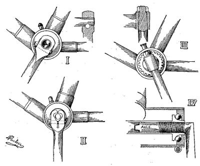 To give any general rule for the cranks removal is impossible, as there are so many manners in use for attaching them to the axle; but, however, the way to remove the several prominent patterns might be useful. We will select four of the general methods, and these will suffice to cover most of the ground. These may be best understood from a study of the accompanying sketches. First, the most common way of putting the cranks on, with a key or pin (No. I). To remove these, unscrew the nut on the pin and drive it out. This might be done at home, but as a rule the pins are put in or become wedged in so tightly that it is frequently advisable to have them driven out at a shop. In the absence of proper punches, there is a great chance of badly mutilating the pin in removal. The second general class is the clamp attachment. There are several patterns in use, but the one described below is most commonly seen (No. II). To free it from the axle the bolt is removed, and it is frequently necessary to insert a wedge to spring the clamps free from it. In the third class the crank fits in a continuation of the axle, usually projecting a little, so as to permit locking with a nut (No. III). Sometimes it passes a little to one side of the centre, and, again, exactly through it. The fourth and last general class is where the axle and cranks are made in two forgings, as shown by No. IV (sketch represents a cross-section of barrel), the part shown being half, and the two sections fitting together by teeth. These cranks are removed by unscrewing in the opposite direction to which they revolve in the propulsion of the machine.