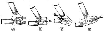 The next part of the wheel we will turn our attention to is the chain—the medium through which the motion is imparted from the driving-gear to the rear sprocket. Frequently after a long ride on rough roads, or perhaps a few days of usage, the chain will be found to have slackened up considerably. There are many devices in use for taking up this slack—all of them, however, working on the principle of moving the rear axle back and forth, and being more or less improvements of a few general patterns. In device "x" in the sketch, after loosening the nut, the axle is moved backward or forward by turning the screw in the proper direction. If it is desired to move the axle back in "y" the screw is tightened, or if it is desirable to move it forward (nearer the cranks), the screw is unscrewed, and the axle pushed forward by gentle taps with a wrench. In "z" the whole bar swings with the axle. This adjustment is tightened or loosened in the same manner as the preceding one, with the exception that the nut on the bolt holding the upper end of the bars has to be loosened a trifle. In "w" the axle is adjusted without the aid of a screw. When in the right place, it is held by the tightening of the nuts, teeth in the washer engaging others around the edge of the slot.