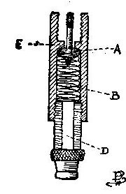 In all experiences with pneumatic tires you will find water the greatest enemy of leaks, and in all cases where one is of sufficient size to be an annoyance, water will surely locate it. The weak point in most valves seems to lie in the plunger that closes the opening through which the air is admitted. Most valves work on the principle explained in the sketch. When the air is forced in, the plunger A is pushed down, admitting the air into D, and so into the tire; and when the downward stroke of the pump ceases, the spring B, assisted by the pressure of the air in the tire, is supposed to push A tightly up against the partition E, and so close the opening. Right here the trouble occurs. For various reasons the spring sometimes does not push the plunger up, and if the pressure is not sufficient to do it, when the pump is removed the air forced in with so much labor blows out in a few seconds. In this case, first drop a little benzine in, as perhaps the valve may be dirty or stuck in some manner, and if this has not the desired effect, it will be necessary to remove the valve. The most common cause of the above annoyance is the spring becoming too much compressed, this being remedied by removing and stretching a little. Frequently the plunger becomes jammed against E, and in pushing it in it disappears entirely within the body of the valve. Here also it is often necessary to take the valve apart.