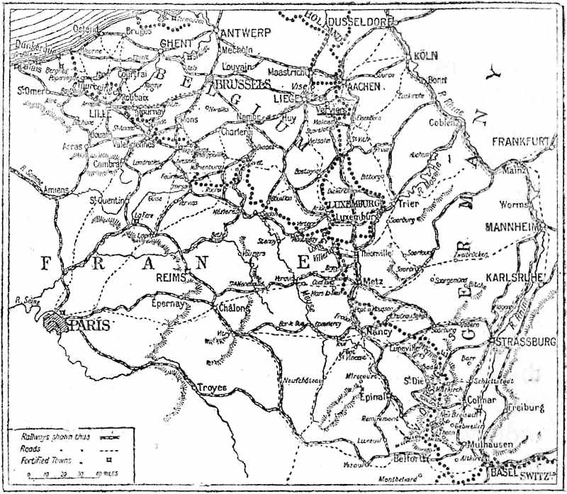 But there are other considerations. Belgium has been the cockpit of Europe, because Belgium, as a military base, has almost unrivalled advantages. Possession or occupation of Belgium—they are much the same thing—means command of its wealth of resources, and of its 3,400 or more miles of excellent main roads. Seizure of these is a great weight in the scale. A powerful army based on Belgium dominates France and more especially Paris. France could be reduced by it to a state of tutelage. Conversely, of course, a great French army based on Belgium would have the Lower Rhine at its mercy, and could “bottle up” Germany more effectively even than a blockade of her coast. That was, in part, how Napoleon held down Prussia. Plainly the neutrality and independence of Belgium is the one common-sense solution; and not less plainly the interests of Great Britain are vitally involved.