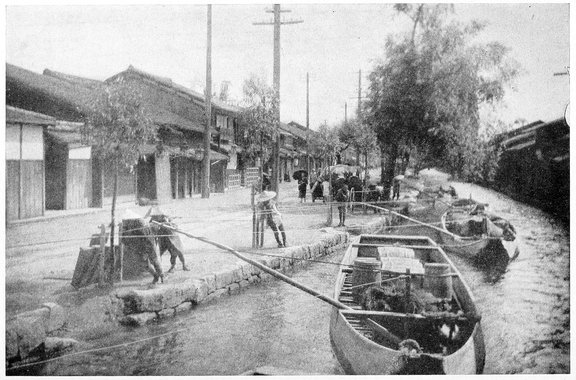 Tokyo Bay, shaped like a whiskey bottle with the neck turned westward, is so nearly land-locked that few masters of sailing vessels attempt to beat their way out of it. When we had begun to heave anchor a fair wind promised to carry the Glenalvon straight out to sea. By dawn, however, it had shifted and before grog had been served it blew from exactly the opposite point of the compass. Nothing was left but to tack back and forth against it. A bellow summoned us on deck before breakfast was half over, to go about ship. A few more mouthfuls and a short pipe and we wore ship again. But it was no use. The head wind increased, the bay was narrow; on the third tack the skipper ventured too close ashore, lost his head, and roared out an order:—